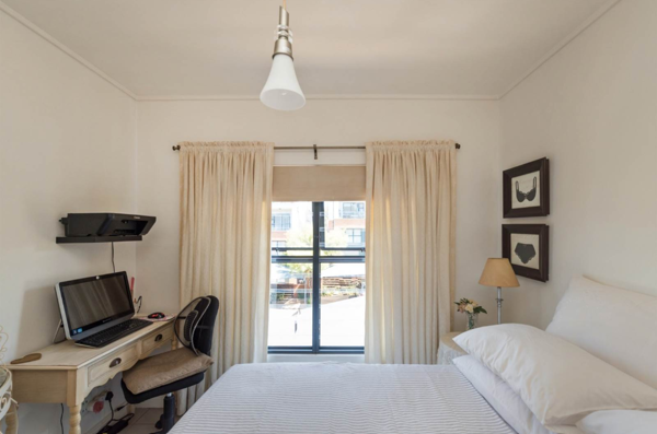 The bedroom is light and inviting, with security taken care of by clear perspex Trellidoor bars on the windows. The bathroom is modern and functional, echoing the apartments clean, uncluttered aesthetic.