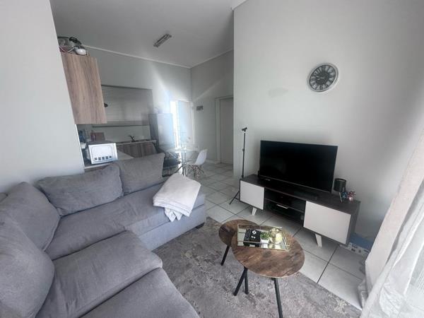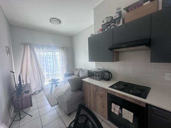 Discover modern living in this inviting 1-bedroom apartment, perfectly situated in the sought-after Linbro Park, Sandton. The open-plan layout seamlessly integrates a contemporary kitchen with the living area, creating a functional and bright space. The kitchen boasts sleek dark cabinetry, light countertops, and integrated appliances including a hob and an oven, all complemented by durable tiled flooring throughout. Natural light floods the living space, enhancing its welcoming ambiance.
