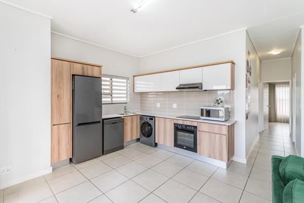 The open-plan living area is crafted for modern living and comes equipped with high-end appliances, including a Defy fridgefreezer combo, a washing machine and dryer, a dishwasher, a built-in hob, and an electric oven, all beautifully complemented by elegant Caesarstone countertops.