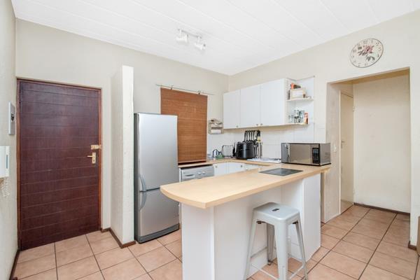 Open plan kitchen has fair cupboard space, an eat in area, space for 1 appliance and a single door fridge.