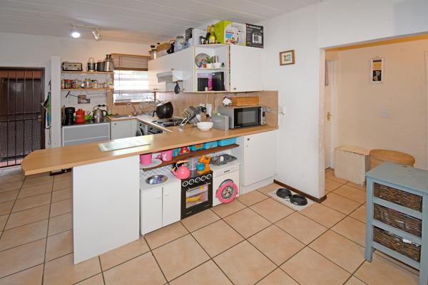 Stunning open-plan kitchen - a vision in Beige and white breakfast bar and space for appliances. Open-plan to lounge, dining room opening onto a spacious covered patio overlooking the lush beautiful private garden with kiddies dolls-house