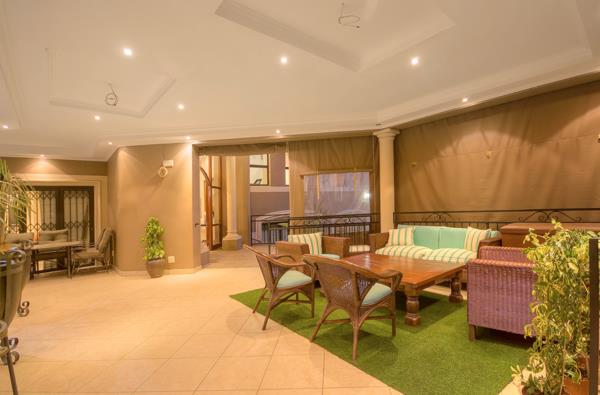The upstairs wing includes an entertainment area with lounge, Jacuzzi and bar overlooking the stunning garden and pool. The covered patio, with roll down blinds and braai is expansive as well as stylish.