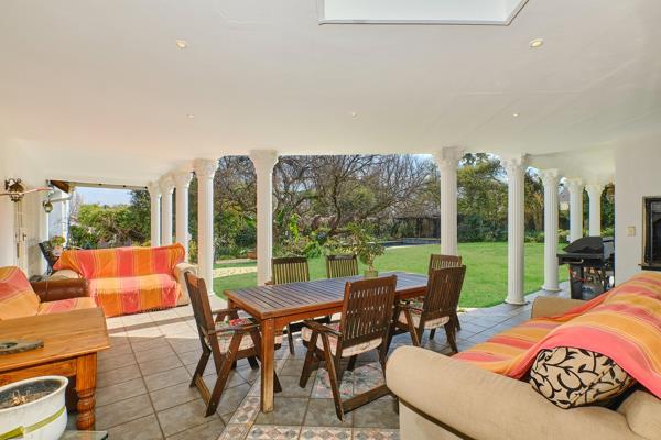 Entrance hall leads to a formal lounge complete with a wood burning fireplace built-in cabinetry and stylish marble topped cocktail bar open plan to the dining room plus an additional cosy family room, all open to a covered entertainers patio, with braai, overlooking a beautiful manicured garden under irrigation, a black salt water pool adds a touch of glamor. A true Chefs Delight dine in kitchen with granite counter tops, walk in pantry, Smeg Electric oven and gas hob, separate scullerylaundry and enormous utility room.
