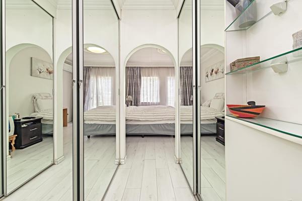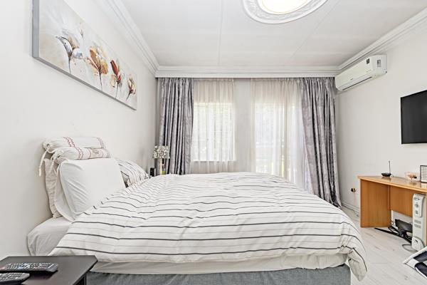 The main bedroom is luxurious, featuring a Juliet balcony, newly fitted built-in cupboards for him and her with glass fronts, and a large air conditioner. The ensuite bathroom is complete with a jacuzzi bath, a shower, and a toilet.