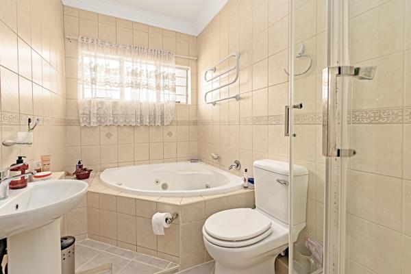 Upstairs, you will find three bedrooms and two bathrooms. Bedrooms one and two are medium-sized and feature laminated flooring. They share a bathroom equipped with both a shower and a bath.