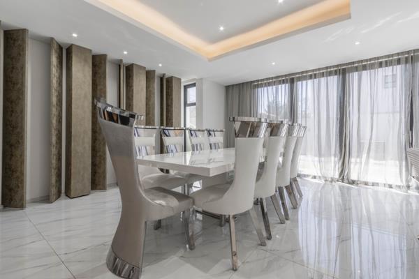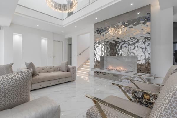 The downstairs living areas are designed for modern open-plan living, with seamless flow from the lounge and dining areas to the landscaped garden and sparkling pool. A feature fireplace adds warmth and character, while the gourmet kitchen boasts integrated appliances, a separate scullery, and sleek finishes.