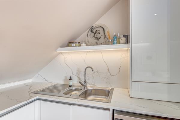 A modern staircase leads up to the sumptuous loft-style bedroom, offering plush carpets, ample cupboard space and a tranquil retreat.
