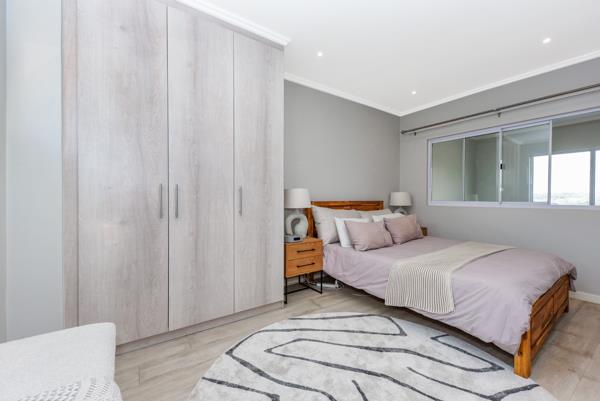 The kitchen is a haven for culinary aficionados, featuring sleek Caesarstone counters, ample space for three under-counter appliances, and a built-in microwave seamlessly integrated within the cupboards. High-end Miele appliances elevate the culinary experience, promising both efficiency and style. From the kitchen, the living space flows effortlessly, creating a harmonious lounge/TV room perfect for relaxation and entertainment. Ascend the stairs to discover the master bedroom, complete with its own luxurious en suite bathroom, offering a private sanctuary within the home.
