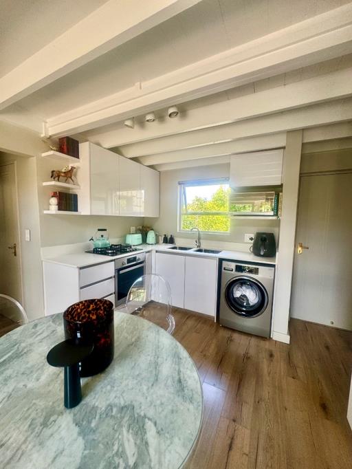 The heart of this home is a modern, compact kitchen, boasting sleek white glossy cabinetry, well designed with a gas hob, and a light countertop. The adjacent dining area, complete with a chic marble-effect table and clear chairs, offers an intimate setting for culinary delights. The seamless flow into the lounge creates an inviting space for relaxation and entertaining, further enhanced by track lighting and a private balcony accessed via sliding doors.