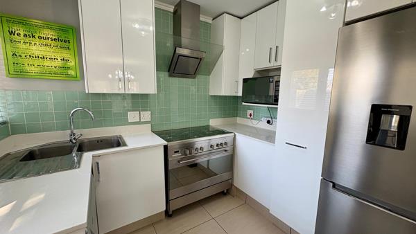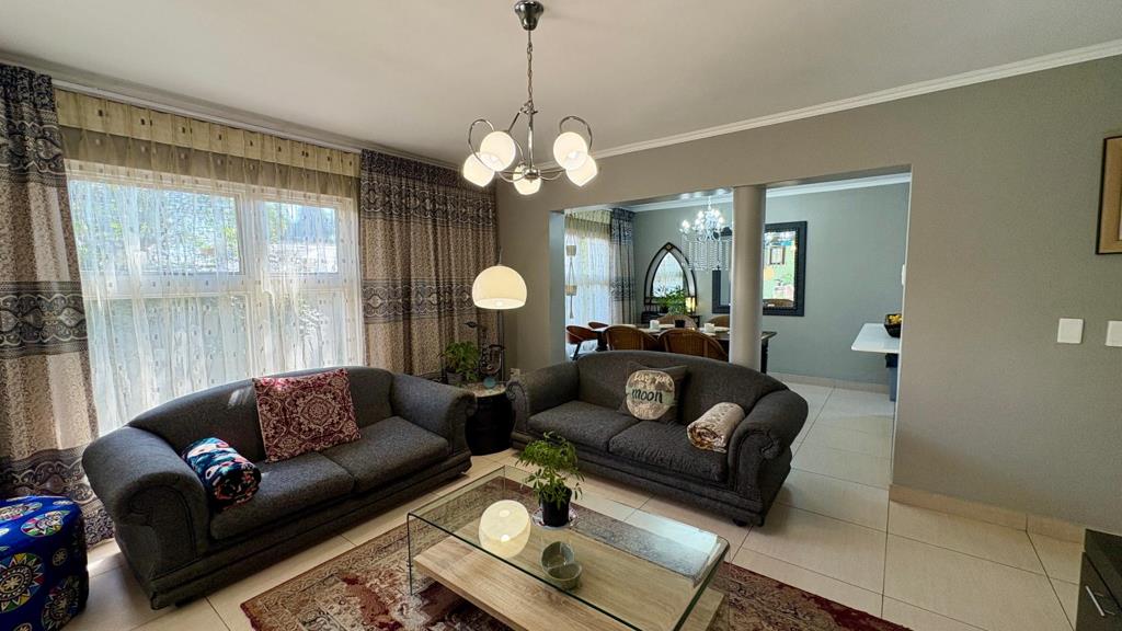 This beautifully renovated home boasts an open-plan living area, seamlessly integrating the lounge, dining, and modern kitchen. The lounge flows effortlessly into a sunny enclosed patio with stack-back doors, inviting natural light and effortless access to the wrap around garden. The kitchen features crisp white granite countertops and cabinets, complemented by a spacious free-standing large stove with gas hob and electric oven.