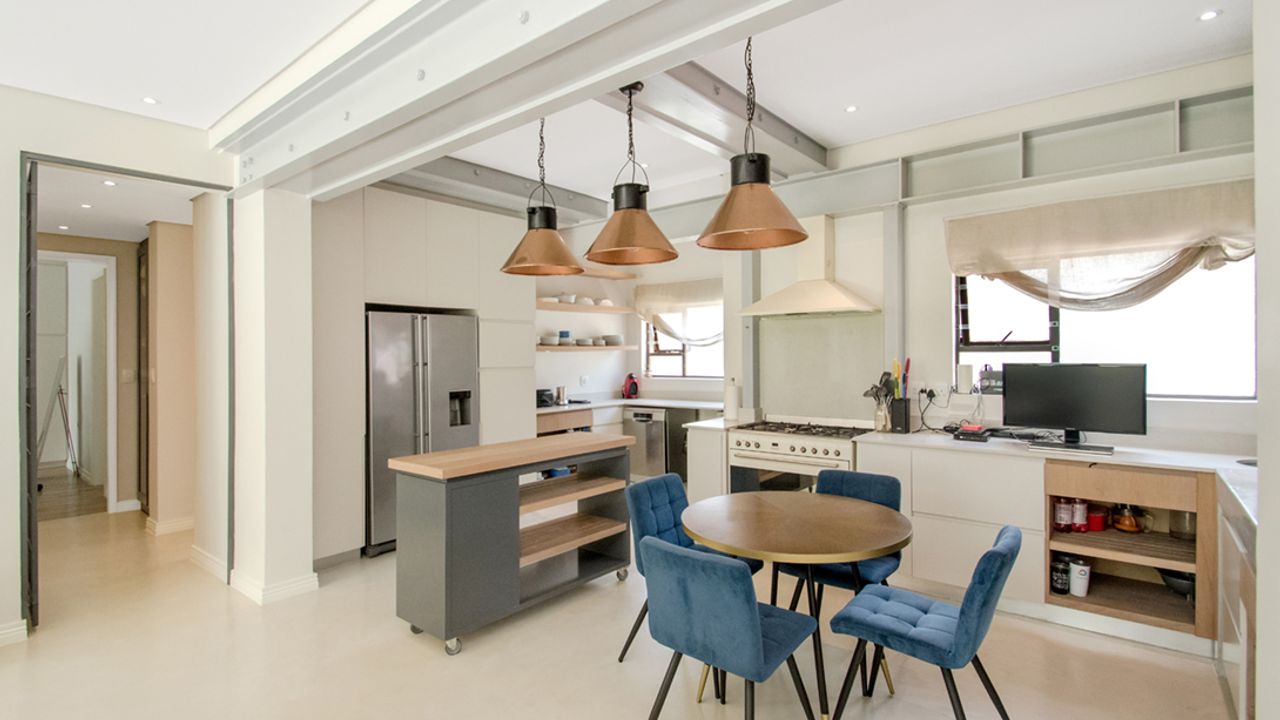 A beautiful open plan modern kitchen with great finishes, center nook, Smeg gas stove, extractor fan, space for a dinning room table with chairs, 3 under counter appliances and a double door fridge