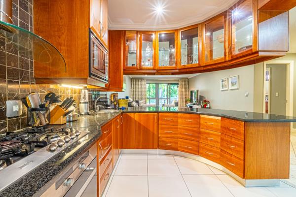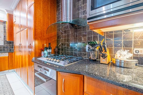 The well-appointed kitchen showcases refined wooden finishes and integrated Miele appliances, including a fridge, freezer, washer, dryer, dishwasher, microwave, stove, and oven. Both bedrooms are spacious and serene, each with its own en-suite bathroom. The primary suite features a walk-in wardrobe and a full bathroom, while the second bedroom accommodates a king-size bed, built-in cupboards, and an en-suite with a shower, basin, and toilet.