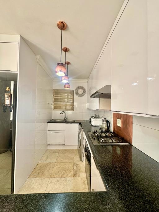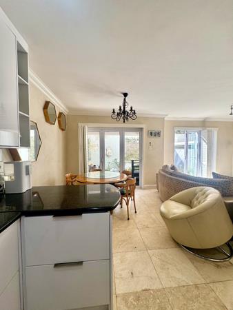 Step into a spacious open-plan lounge and dining area, seamlessly flowing into a stylish kitchen featuring granite countertops, gas hob, built-in dishwasher, and breakfast nook. Aluminium sliding doors open onto a covered patio, perfect for entertaining, with an established, irrigated private garden adding a touch of greenery and tranquillity.