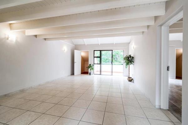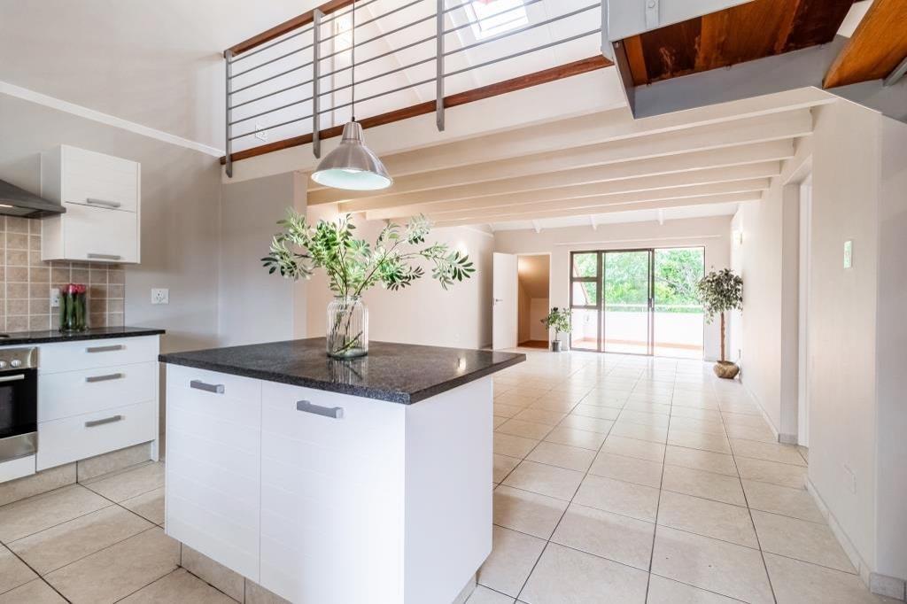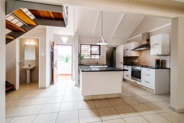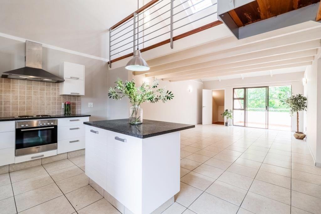 King-size bedroom with ample wardrobes and walk in cupboard opens to the terrace. En suite bathroom with both bath and shower, marble vanity. Generous light and breezy lounge features lofty double volume ceilings and leads to the terrace - perfect for sunning or starlit dining with its pretty leafy outlook. The skylit semi - open loft area with cupboards and bathroom make this a versatile space for a 2nd bedroom / home office. Appealing kitchen has granite tops, lots of cupboards, centre island and a separate laundry ''room'' and overlooks the lounge and terrace area. Guest cloakroom. Outside storage room. 2 Parking bays. Attractive pool area. Lift in complex