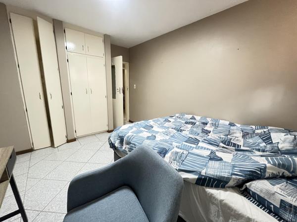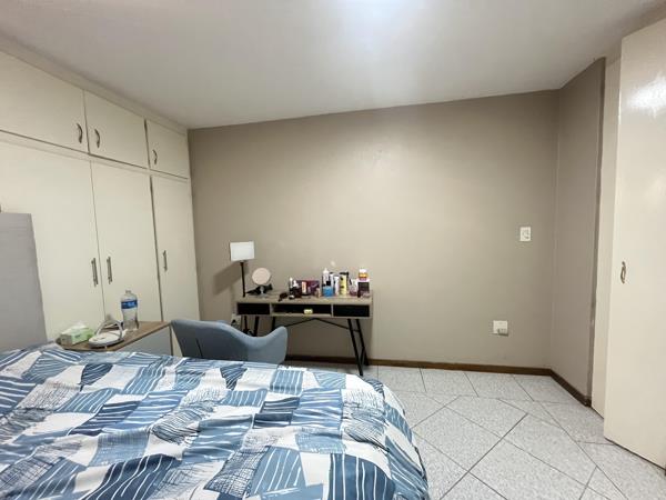 The apartment features a functional kitchen with built-in cupboards, a single sink, an electric stove and oven, and space for two appliances and a fridge. The open-plan living and dining area flows onto a covered patio with a small garden, creating an ideal space for outdoor relaxation. Both bedrooms are spacious and feature built-in cupboards, with the main bedroom offering added comfort. The unit is fibre-ready and includes one covered parking bay conveniently located near the unit, plus ample open parking for visitors.
