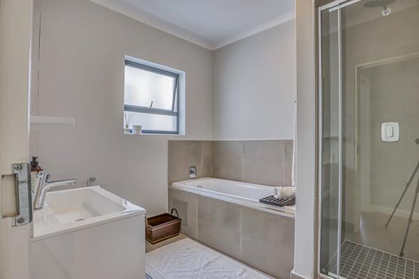 The two modern, fully tiled bathrooms feature sleek fixtures and finishes.