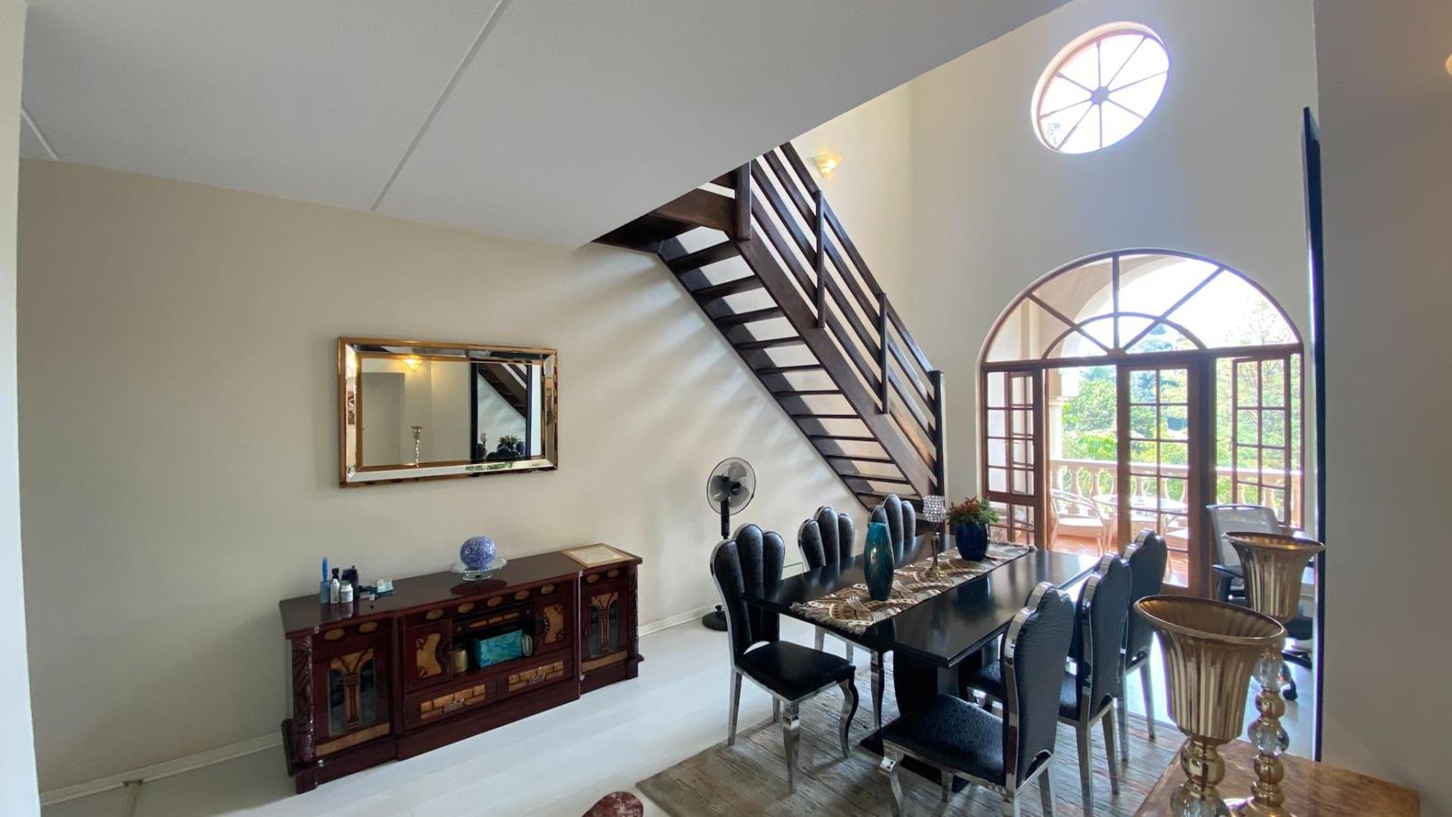 An open plan kitchen with a breakfast nook, stunning double volume dining area which opens out to a a covered balcony. large loft lounge/TV family room, opening out to a terraced patio with an outdoor shower and beautiful views over Morningside. Ideal for entertaining guests and family, the perfect spot to enjoy sundowners after a busy day at the office.