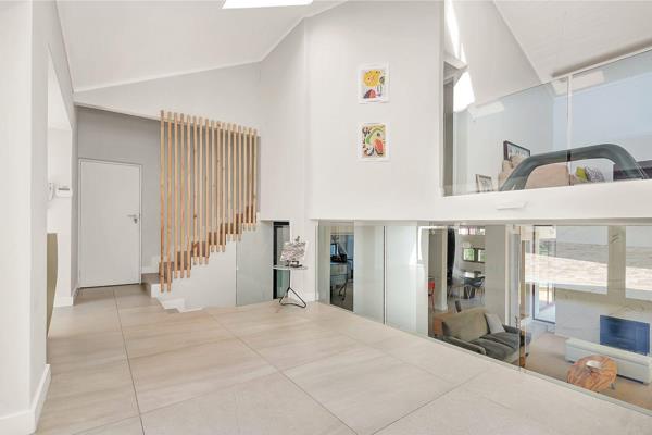 The double volume entrance hall looks through the open plan living spaces to the patio and forested garden.