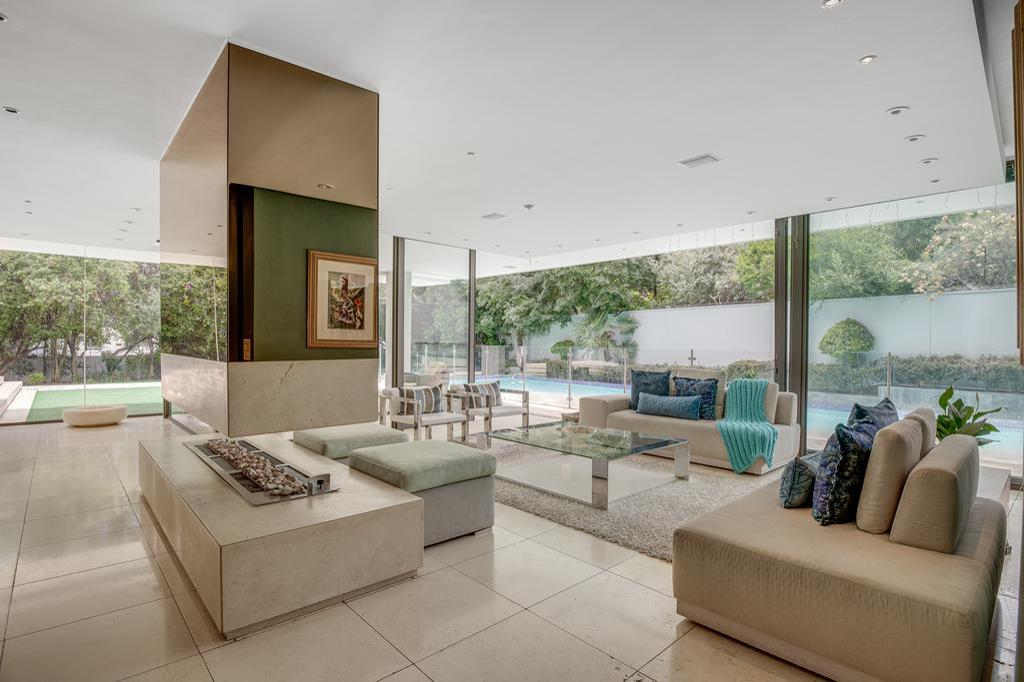 The kitchen opens onto a dining room and lounge with a gas fireplace both opening onto patio and feature pool.