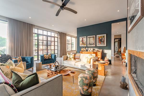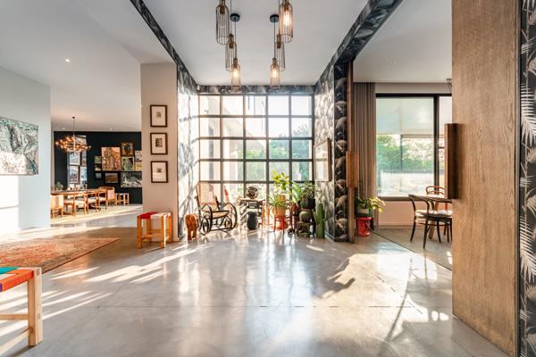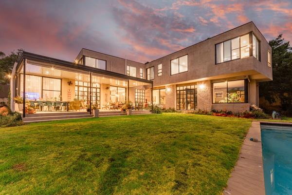 The home beckons entry through a grand entrance hall with high ceilings and beautifully textured walls leading through to various open-plan reception rooms for every occasion. There is a space for everyone and everything, and the home demands that you immediately relax and soak in the glorious views of the sprawling gardens through double glazed black aluminum glass windows which prevail throughout and flow out to the undercover patio with separate covered braai area and sparkling pool.