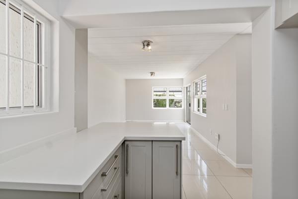 Modern open plan kitchen with Caesarstone countertops, onto dining and lounge with sliders into the private established garden.