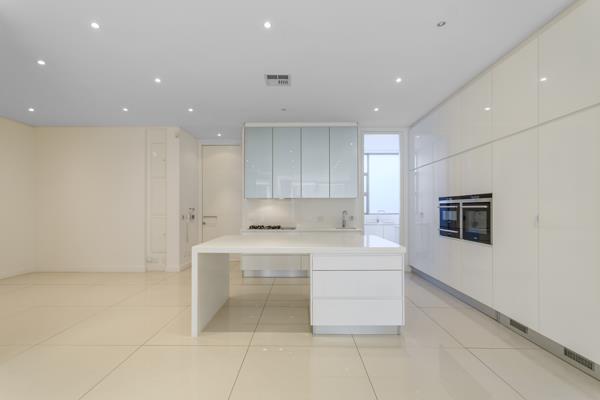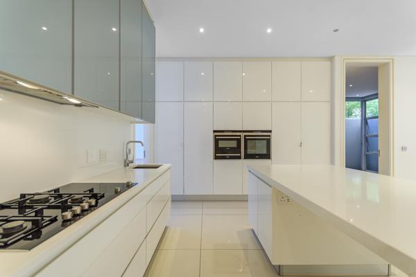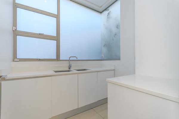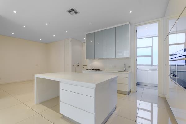 A chefs kitchen with integrated fridge and freezer, an electric stove top and a gas hob with complex wide piped gas, ovens and high gloss cabinetry throughout greet you upon entering the apartment. The Ceaser-stone counter tops compliment the clean, white lines and integrated finishes everywhere you look in the home. A separate scullery with integrated appliances for your convenience is located just behind the kitchen area.