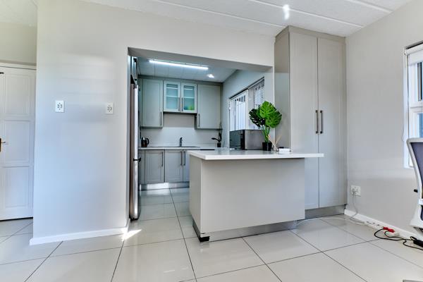 Downstairs has tiled lounge dining open plan casesarstone kitchen with electric stove and one appliance space.