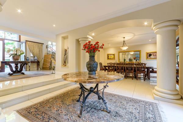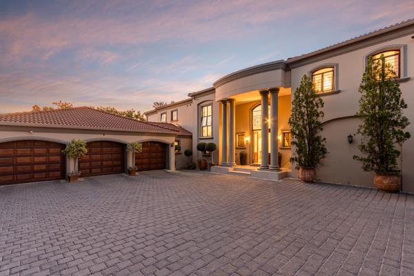 Accommodation is ideal for the larger or extended family with 5 bedroom suites, a fabulous eat-in kitchen and breakfast room, a completely separate gentlemens entertainment room with home theatre, games room and cocktail bar. Beautifully integrated dining area, family room, formal lounge with fireplaces and wine cellar. Plus, a separate study, 4 garages, double staff accommodation, borehole and more. All protected by state of the art security within a strictly guarded boomed enclosure.