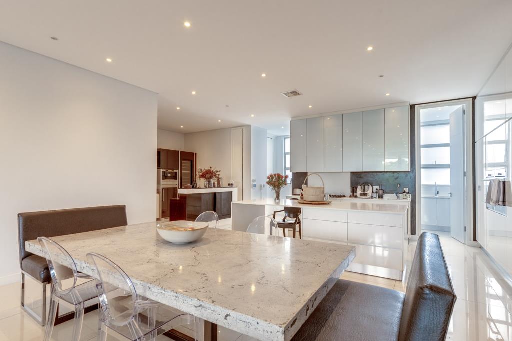The heart of the home is the state-of-the-art kitchen, featuring integrated appliances, a gas hob, sleek high-gloss cabinetry, and a striking center island/breakfast bar, perfect for both casual dining and entertaining. A discreet scullery/laundry nook ensures practicality without compromising the elegant design. Adjacent to the kitchen is an impressive built-in bar equipped with a wine cooler, mini bar fridge, and a coffee station, making it a true entertainers delight.