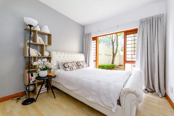 An immaculate, generous bedroom awaits you. Finished with ample built-in cupboards, laminate wood flooring and direct access to the garden, this space is ready for you to create your own private sanctuary.