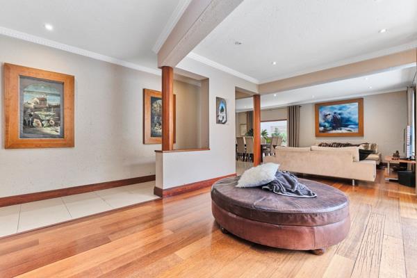 The expansive entertainment area flows seamlessly from the reception hall, featuring a spacious living, dining, and family room, complete with a sophisticated cocktail bar. The perfect space for hosting friends and family, this impressive area opens onto a expansive covered patio, overlooking a meticulously manicured garden and sparkling pool.