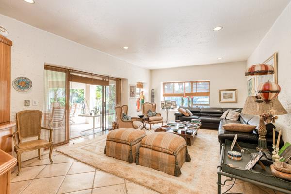 Large covered patio flowing onto magnificent garden and pool with server and built-in braai space