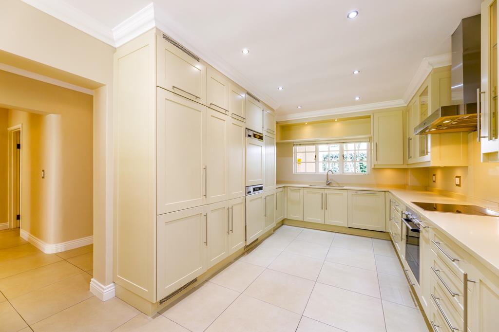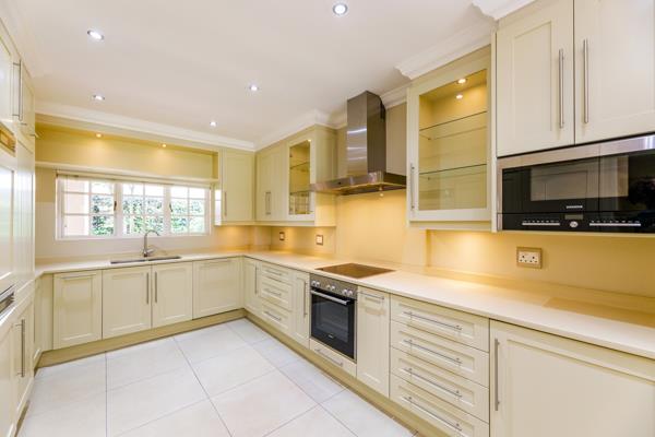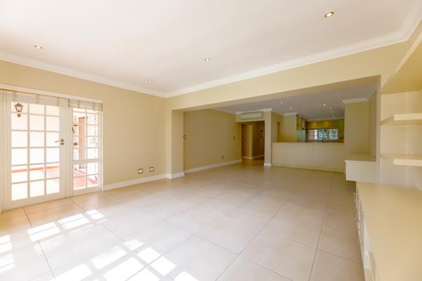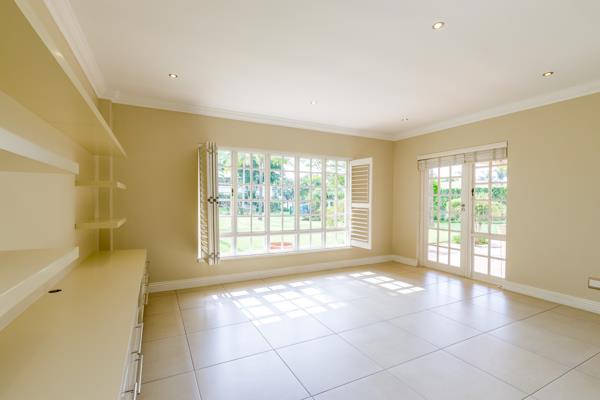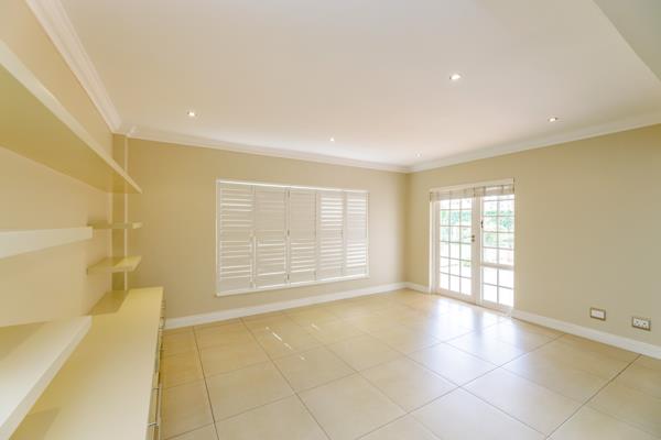 Flowing from the kitchen, the open-plan dining and lounge area is enhanced by air conditioning, custom built-in storage and desk, and a bespoke TV unit. Expansive picture windows, fitted with American shutters, frame tranquil garden views, while a glass door leads to a private, covered patio, an ideal space to unwind or entertain.