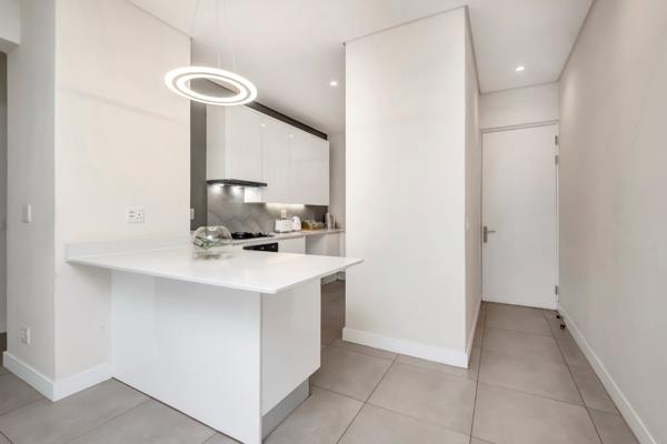 The open-plan kitchen features sleek Caesarstone countertops, a breakfast counter, high-gloss cabinetry, a double sink, gas stove, electric oven, and space for two under-counter appliances and a single-door fridge.