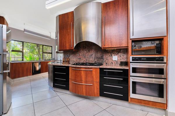 A unique breakfast counter draws you into a beautifully designed kitchen featuring speckled granite countertops, cherry and black wood cabinetry, and sleek brushed steel finishes. Home chefs will appreciate the gas stovetop with extractor, two integrated ovens (one with a warming drawer), and the scullery area has space for three under-counter appliances. For added convenience there are two seperate storerooms and direct access from the double automated garage.