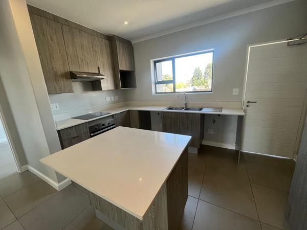 The modern kitchen has an island and granite kitchen tops! Space for 2 appliances with both with water outlets.