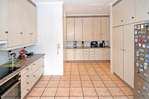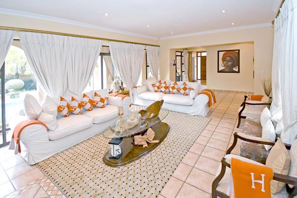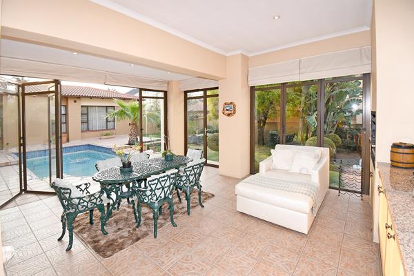 The enclosed patio with built-in gas braai opens with stacking doors onto the beautifully manicured garden and sparkling pool, creating the ultimate setting for relaxed outdoor living and effortless entertaining.