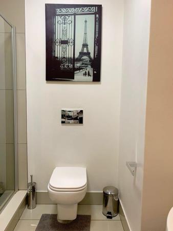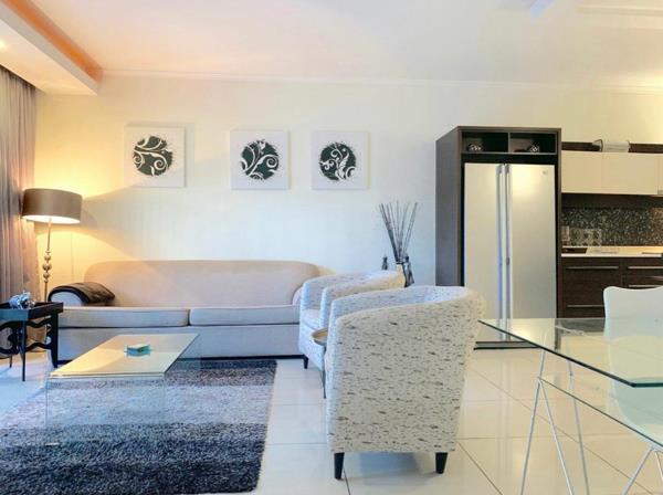 The modern ground apartment features 2 bedrooms , 2 bathrooms , a kitchen, an open-plan lounge leading to a private garden, and underground parking for 2 cars.