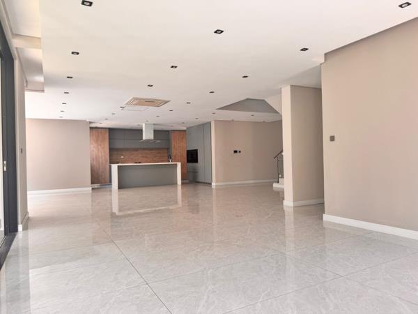 The open-plan design harmoniously connects two stylish lounges and a sophisticated dining area, all adorned with sleek, large-format polished tiles and abundant recessed lighting. The contemporary kitchen is a chef''s dream, equipped with a generous central island, integrated appliances, and extensive cabinetry, ensuring a seamless culinary experience.