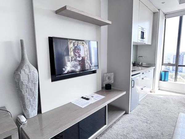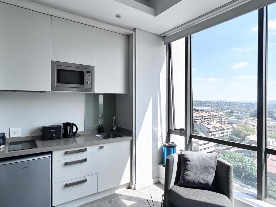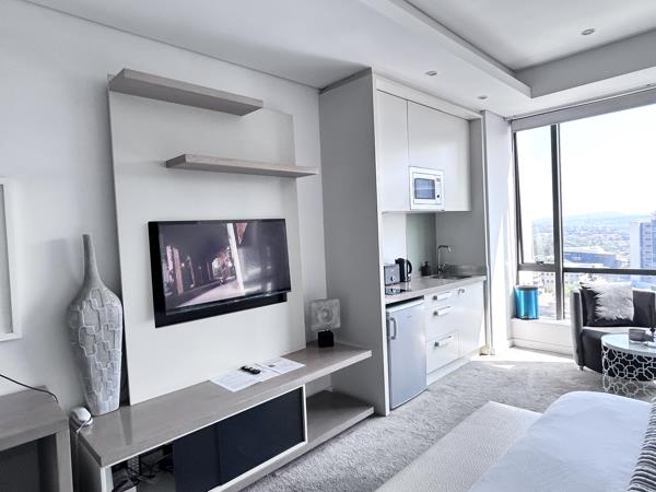 The open-plan layout features a sleek kitchenette with a fridge and microwave, a comfortable lounge area, dedicated workspace, satellite flat-screen TV, and a modern, well-appointed bathroom. Large windows invite an abundance of natural light while showcasing beautiful views of the Sandton skyline.