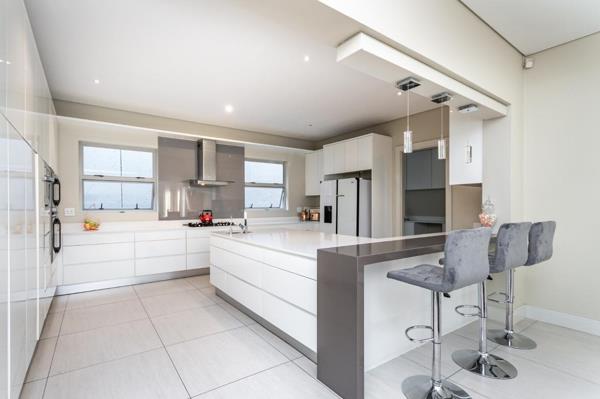 Step inside to an inviting entrance hall that flows into multiple open-plan living areas, including two lounges, a dining room, and a dedicated familyTV room. High ceilings, abundant natural light, and sleek tiled flooring create an airy ambiance, while a stylish wooden staircase with integrated lighting adds a touch of elegance. The heart of the home is a state-of-the-art kitchen, featuring high-gloss white cabinetry, a large central island with a breakfast bar, integrated appliances, and ample storage, perfect for culinary enthusiasts. A separate laundry and staff quarters enhance convenience.
