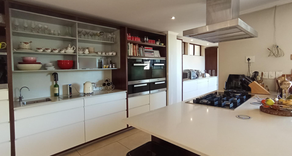 Step inside to discover an expansive, open-plan interior, highlighted by a contemporary kitchen designed for both functionality and style. It features a substantial central island with a gas cooktop, integrated high-end appliances such as a Miele oven and coffee machine, and extensive storage solutions including open shelving and glass display cabinets. A dedicated pantry further enhances the culinary experience, flowing seamlessly into the dining room and a comfortable family TV room, perfect for modern living and entertaining.