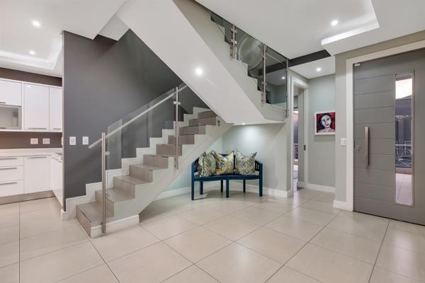 This open-plan entertainers dream offers an ultra-modern lounge and dining area flowing out to a spacious patio complete with built in bar counter and prep sink. The well-appointed, state-of-the-art kitchen offers sleek Caesar stone counters, double eye-level oven, electric stove, space for a double door fridge, and a large central island with bar stools ideal for socializing. The island discreetly houses two under-counter appliances.