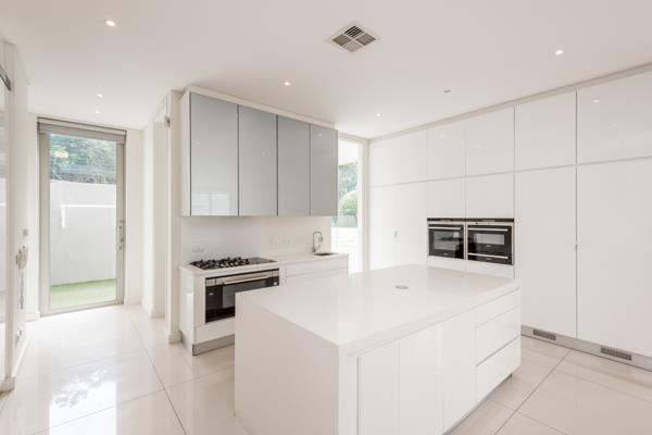 Step inside to an inviting open-plan layout, where the open plan environment abundant natural light create an airy atmosphere. The heart of this home is its ultra-modern kitchen, boasting extensive white high-gloss cabinetry, a large central island, and integrated appliances including a gas hob and ovens.