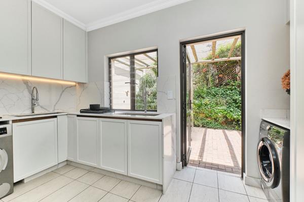 Designed for effortless, luxurious living, the open-plan dining and kitchen area forms the heart of the home. The gourmet kitchen is a masterpiece of contemporary design, featuring crisp white marble countertops, contrasting black-and-white cabinetry, integrated appliances, and a gas stove. A generous centre island and eat-in counter create an inviting hub for entertaining, while the adjoining scullery and laundry offer practical convenience. A discreet door leads to a private courtyard and drying yard, from which steps rise to a separate guest suite or staff accommodation, ensuring privacy and independence.