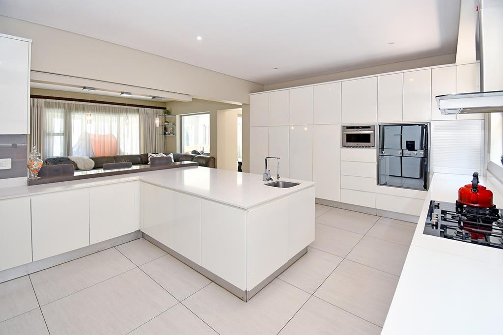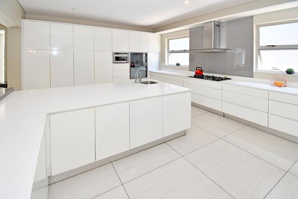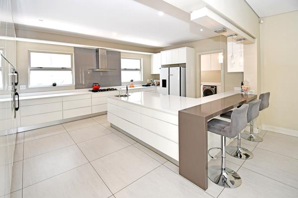 The designer kitchen is the heart of the home, boasting high-gloss cabinetry, Caesarstone counters, a central island with breakfast bar, gas hob, double ovens, integrated appliances, a water filtration system, and a separate scullerylaundry.