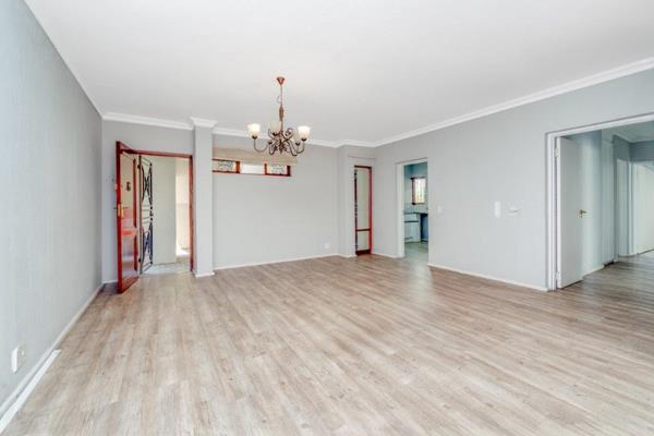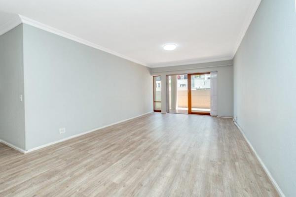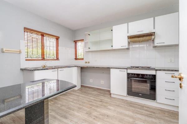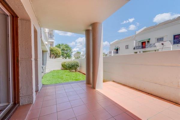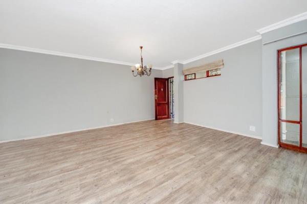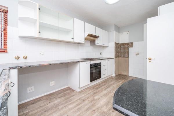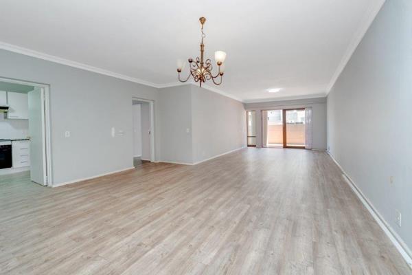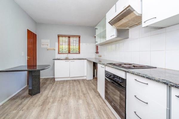 Discover this inviting 151 sqm ground floor residence, perfectly situated within a secure residential development in Morningside, Sandton. The property presents an appealing exterior and an open-plan layout, connecting the living and dining areas, featuring Vinyl Novilon flooring throughout creating a welcoming atmosphere, with wooden sliding door opening onto a covered private patio and garden. The modern kitchen is a highlight, boasting sleek white cabinetry, granite countertops, including space for a dishwasher and washing machine and double fridge, designed for contemporary living.