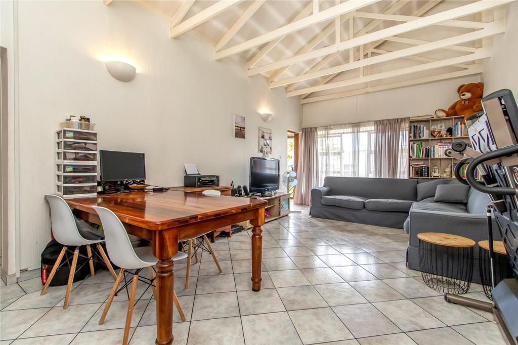The bright and inviting living area offers a wonderful sense of space, enhanced by high vaulted ceilings with exposed trusses that create an airy, open feel. Large recessed windows and a sliding door allow natural light to flood the room, while tiled floors provide a practical, low-maintenance finish. The layout comfortably accommodates a generous lounge suite and entertainment area, making it ideal for both relaxed family living and entertaining. Neutral tones throughout offer a versatile backdrop, allowing the home to be easily styled to suit any dcor. This warm, functional space forms the heart of the home, seamlessly connecting indoor comfort with outdoor light and views.