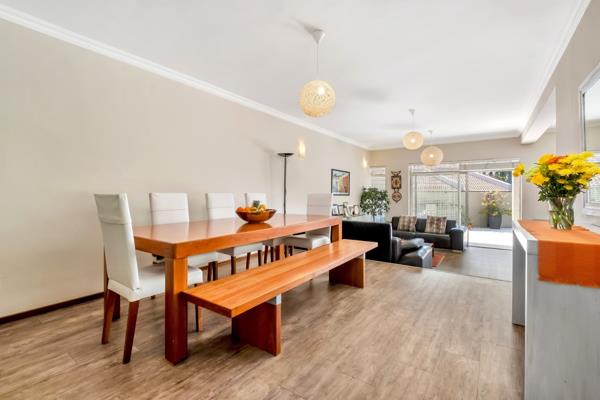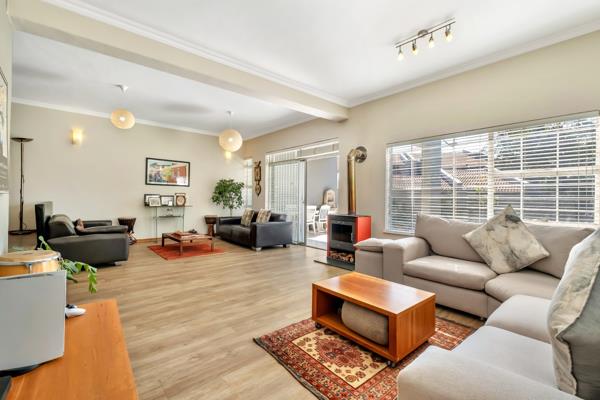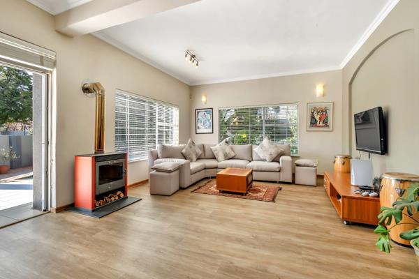 The home has a refreshing flow of open plan reception areas enhanced by high ceilings, large windows overlooking the garden and sliding doors opening out to the covered patio. The dining room and generous sunken lounge are warmed by a designer Hydrofire fireplace.