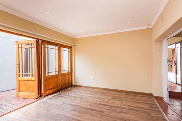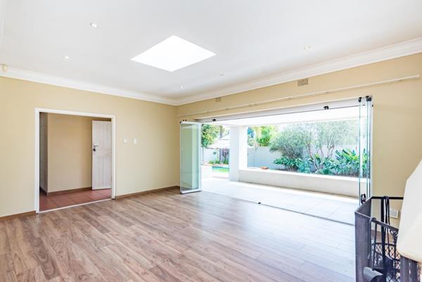 Living area with a fireplace has stack doors leading to the covered patio overlooking the garden and pool.